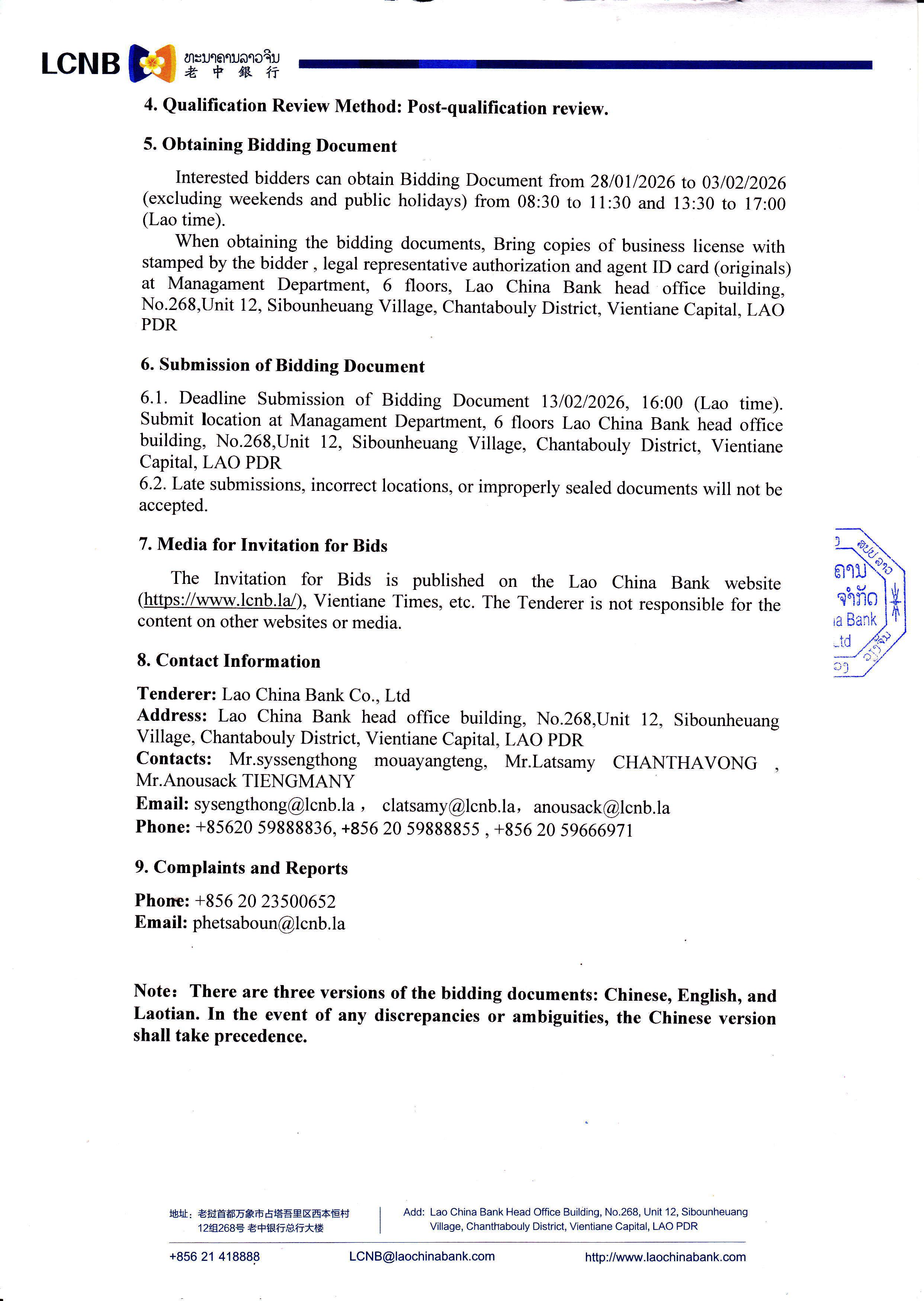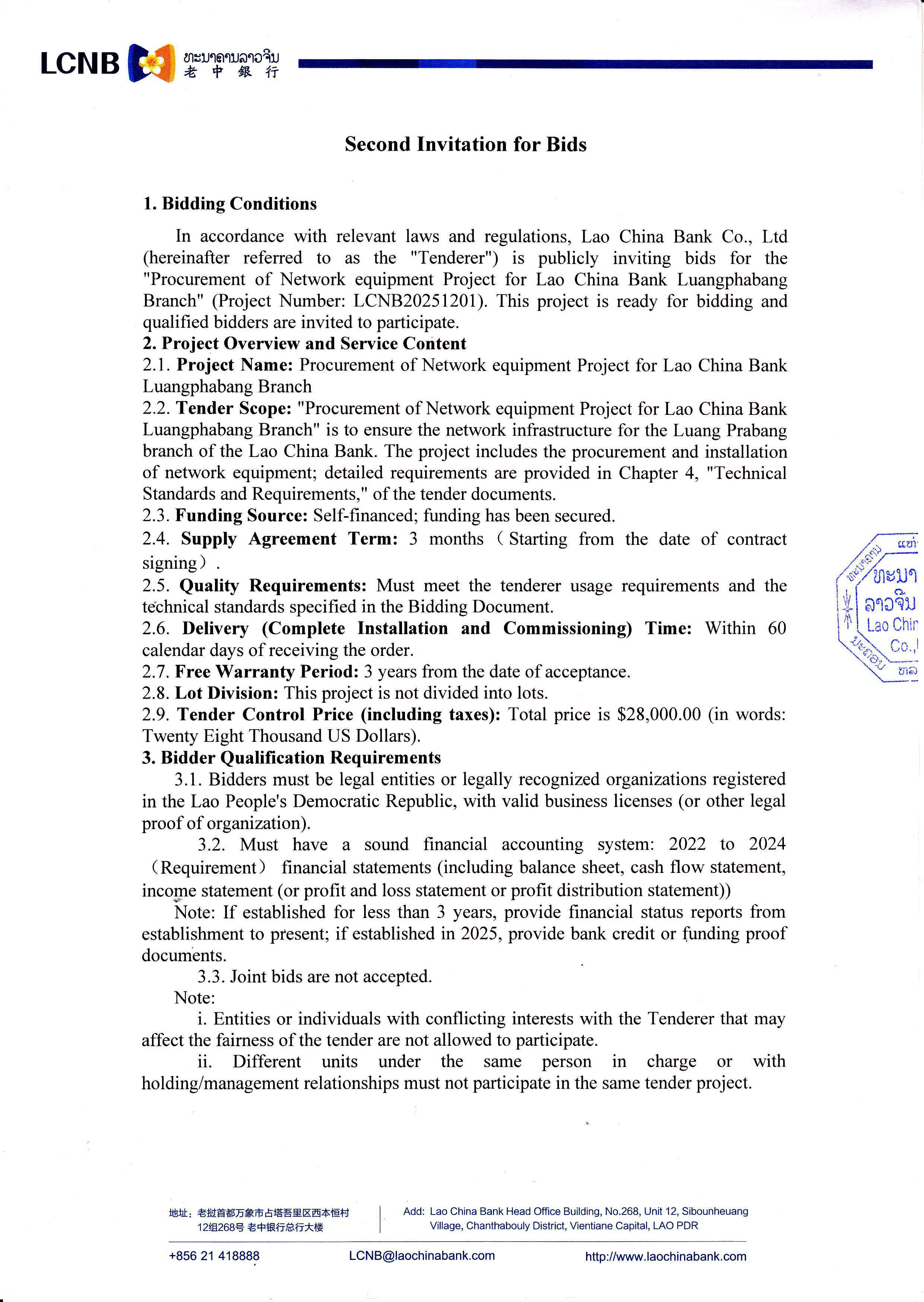 Invitation for Bids Procurement of Network equipment Project for Lao China Bank Luangphabang Branch